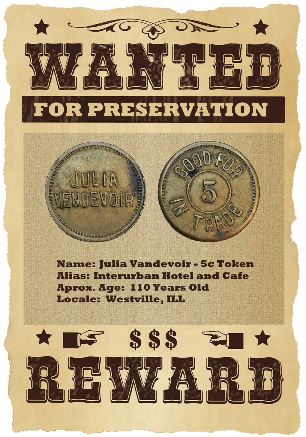 The following table describes Westville Tokens which are also not yet a part of my collection, however no known photos exist.Have a photo of one or more of these tokens? Please use the Submit button below to send your photos!